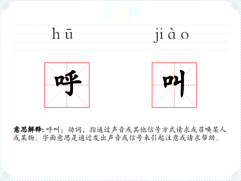 呼叫:动词,指通过声音或其他信号方式请求或召唤某人或某物。字面意思是通过发出声音或信号来引起注意或请求帮助。