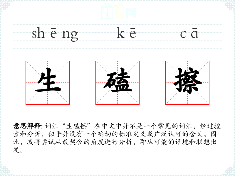由于“生磕擦”不是一个标准词汇,我们无法给出一个确切的字面意思和基本含义。它可能是由“生”、“磕”和“擦”三个字组合而成的,但这种组合在标准汉语中并不常见。