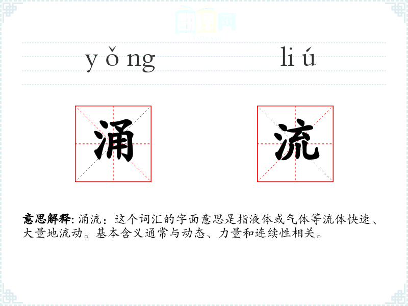 “涌流”是一个富有动态和力量感的词汇,适用于多种语境,能够丰富语言表达的层次和深度。在语言学*和表达中,掌握和灵活运用这样的词汇,可以增强沟通的效果和文学创作的表现力。