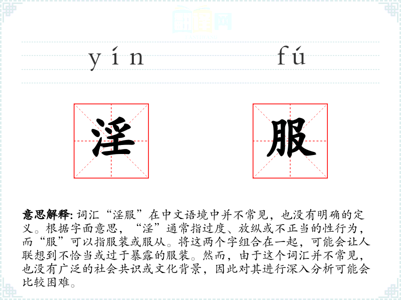 由于“淫服”不是一个标准的词汇,我们无法给出一个确切的基本定义。它可能被误解为指代不适当或过于暴露的服装。