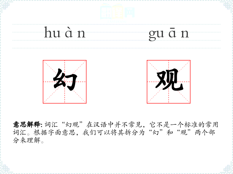 词汇“幻观”在汉语中并不常见,它不是一个标准的常用词汇。根据字面意思,我们可以将其拆分为“幻”和“观”两个部分来理解。