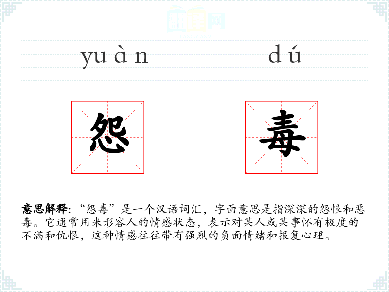 “怨毒”是一个汉语词汇,字面意思是指深深的怨恨和恶毒。它通常用来形容人的情感状态,表示对某人或某事怀有极度的不满和仇恨,这种情感往往带有强烈的负面情绪和报复心理。