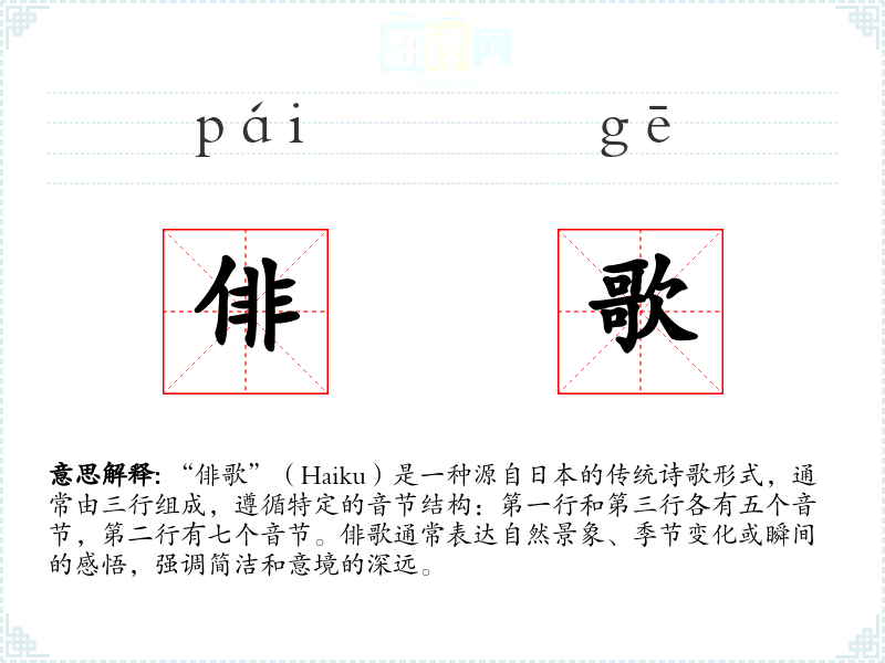 “俳歌”一词源自日语“俳句”(Haiku),最初是“俳諧の句”(Hai-ka-i no Ku)的简称,意为“幽默的句子”。随着时间的推移,俳歌逐渐发展成为一种独立的诗歌形式,强调自然和生活的简单美。