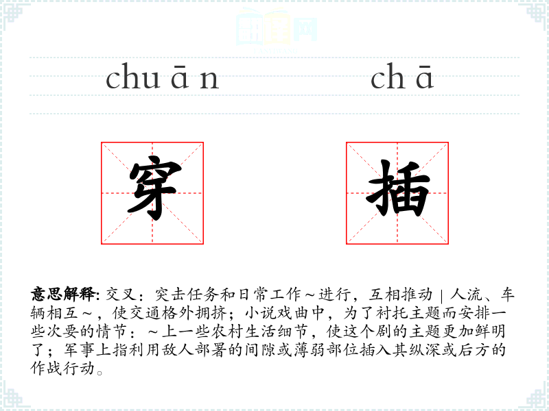 1.交叉:突击任务和日常工作~进行,互相推动|人流、车辆相互~,使交通格外拥挤;小说戏曲中,为了衬托主题而安排一些次要的情节:~上一些农村生活细节,使这个剧的主题更加鲜明了;军事上指利用敌人部署的间隙或薄弱部位插入其纵深或后方的作战行动。