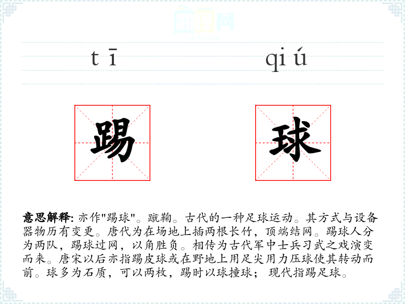 1.亦作"踢球"。蹴鞠。古代的一种足球运动。其方式与设备器物历有变更。唐代为在场地上插两根长竹,顶端结网。踢球人分为两队,踢球过网,以角胜负。相传为古代军中士兵习武之戏演变而来。唐宋以后亦指踢皮球或在野地上用足尖用力压球使其转动而前。球多为石质,可以两枚,踢时以球撞球; 现代指踢足球。