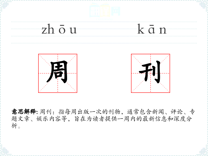 “周刊”一词由“周”和“刊”组成。“周”指一周的时间周期,“刊”指刊物或出版物。这个词在中文中的使用历史悠久,随着印刷技术和传媒行业的发展,其含义和使用方式基本保持稳定。