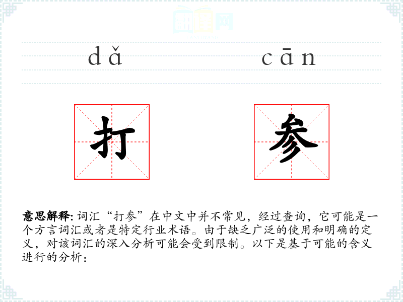 “打参”可能是指在某些方言中,“打”表示进行某种活动,“参”可能指参与或加入。因此,“打参”可能意味着参与或加入某个活动或组织。