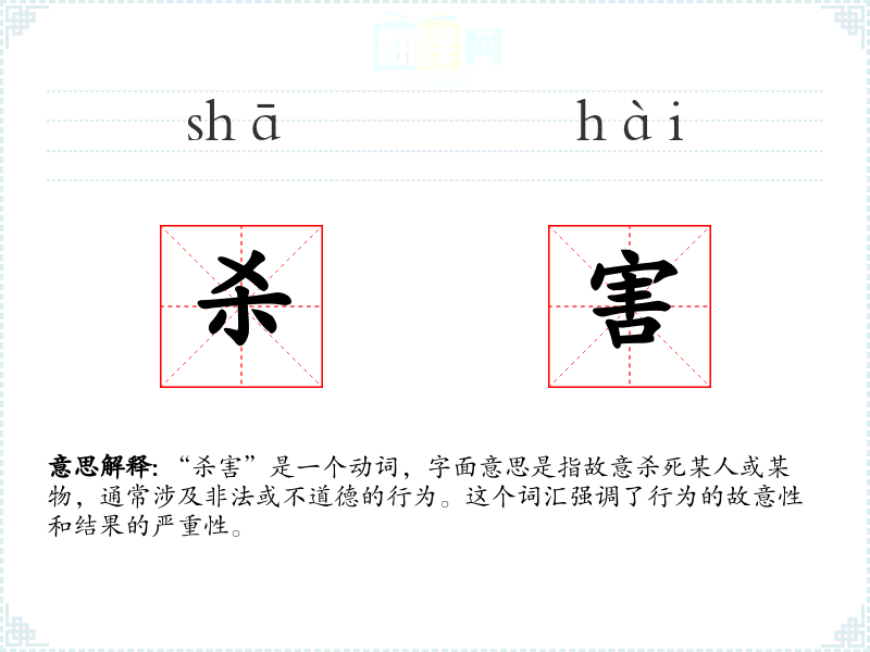 “杀害”是一个动词,字面意思是指故意杀死某人或某物,通常涉及非法或不道德的行为。这个词汇强调了行为的故意性和结果的严重性。