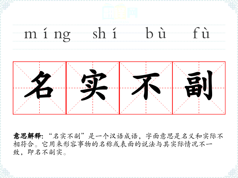 “名实不副”是一个汉语成语,字面意思是名义和实际不相符合。它用来形容事物的名称或表面的说法与其实际情况不一致,即名不副实。