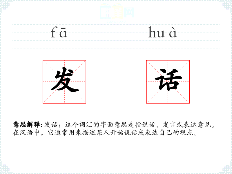 发话:这个词汇的字面意思是指说话、发言或表达意见。在汉语中,它通常用来描述某人开始说话或表达自己的观点。