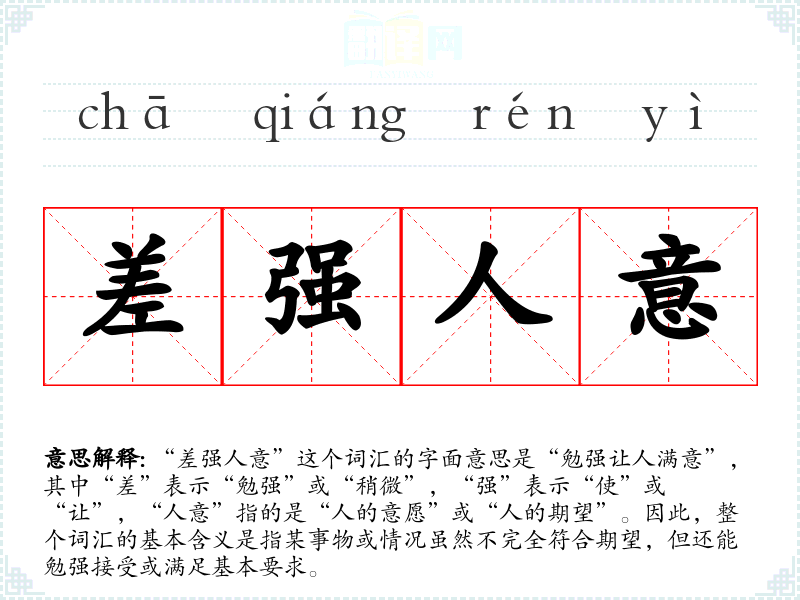 “差强人意”这个词汇的字面意思是“勉强让人满意”,其中“差”表示“勉强”或“稍微”,“强”表示“使”或“让”,“人意”指的是“人的意愿”或“人的期望”。因此,整个词汇的基本含义是指某事物或情况虽然不完全符合期望,但还能勉强接受或满足基本要求。