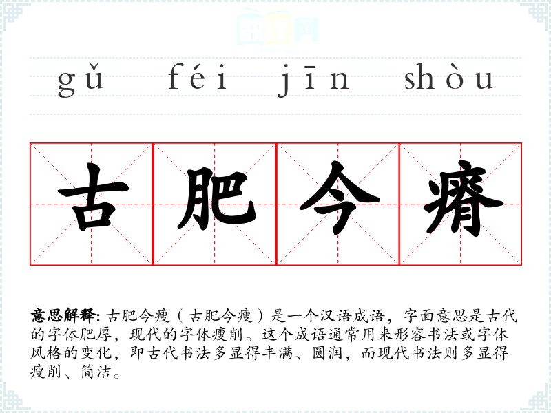 古肥今瘦(古肥今瘦)是一个汉语成语,字面意思是古代的字体肥厚,现代的字体瘦削。这个成语通常用来形容书法或字体风格的变化,即古代书法多显得丰满、圆润,而现代书法则多显得瘦削、简洁。