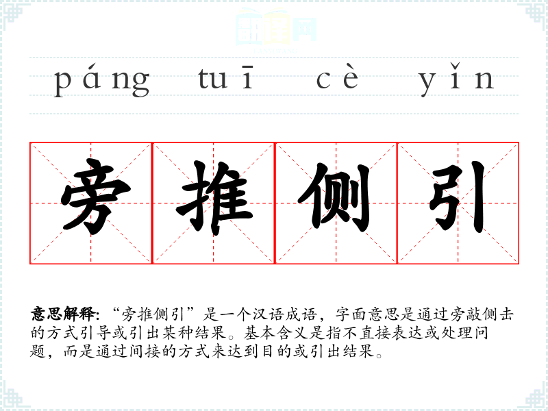 “旁推侧引”是一个汉语成语,字面意思是通过旁敲侧击的方式引导或引出某种结果。基本含义是指不直接表达或处理问题,而是通过间接的方式来达到目的或引出结果。