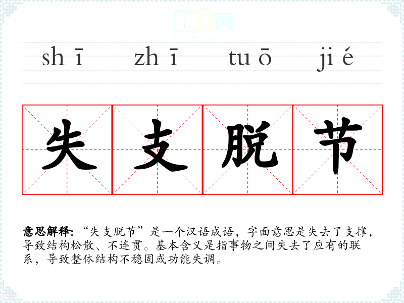“失支脱节”是一个汉语成语,字面意思是失去了支撑,导致结构松散、不连贯。基本含义是指事物之间失去了应有的联系,导致整体结构不稳固或功能失调。