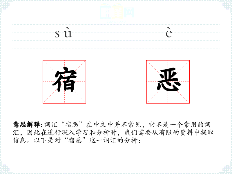 词汇“宿恶”在中文中并不常见,它不是一个常用的词汇,因此在进行深入学*和分析时,我们需要从有限的资料中提取信息。以下是对“宿恶”这一词汇的分析:
