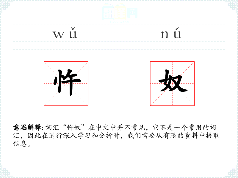 词汇“忤奴”在中文中并不常见,它不是一个常用的词汇,因此在进行深入学习和分析时,我们需要从有限的资料中提取信息。