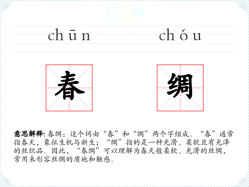 春绸:这个词由“春”和“绸”两个字组成。“春”通常指春天,象征生机与新生;“绸”指的是一种光滑、柔软且有光泽的丝织品。因此,“春绸”可以理解为春天般柔软、光滑的丝绸,常用来形容丝绸的质地和触感。