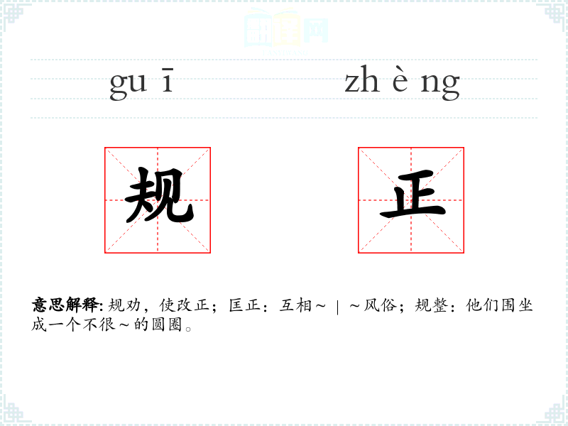 规劝,使改正;匡正:互相~|~风俗;规整:他们围坐成一个不很~的圆圈。