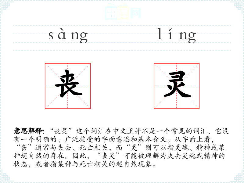 “丧灵”这个词汇在中文里并不是一个常见的词汇,它没有一个明确的、广泛接受的字面意思和基本含义。从字面上看,“丧”通常与失去、死亡相关,而“灵”则可以指灵魂、精神或某种超自然的存在。因此,“丧灵”可能被理解为失去灵魂或精神的状态,或者指某种与死亡相关的超自然现象。