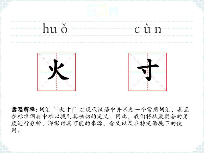 词汇“[火寸]”在现代汉语中并不是一个常用词汇,甚至在标准词典中难以找到其确切的定义。因此,我们将从最契合的角度进行分析,即探讨其可能的来源、含义以及在特定语境下的使用。