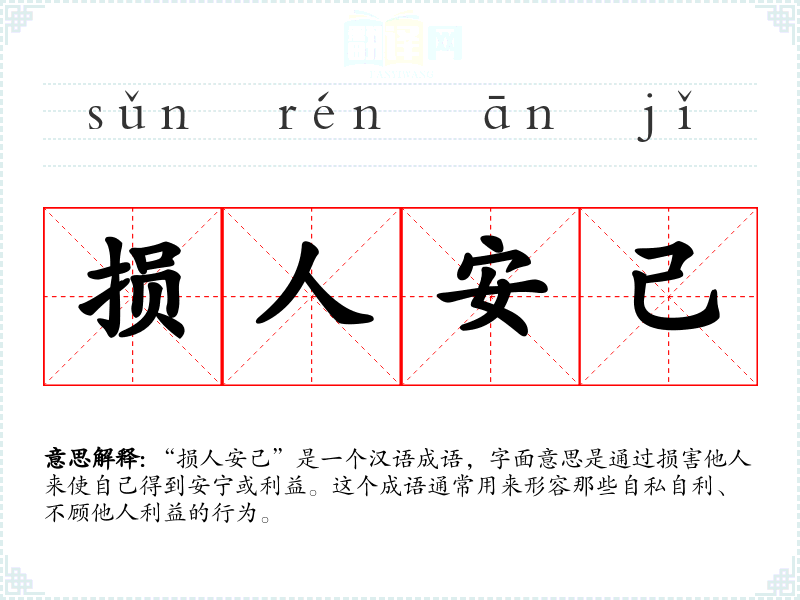“损人安己”是一个汉语成语,字面意思是通过损害他人来使自己得到安宁或利益。这个成语通常用来形容那些自私自利、不顾他人利益的行为。