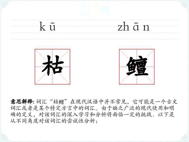 “枯鳣”可能指的是一种干枯的鱼类,其中“枯”表示干枯、无生命的状态,“鳣”可能是一种古代文献中提到的鱼类。然而,由于缺乏具体的历史文献支持,这个定义仅是推测性的。