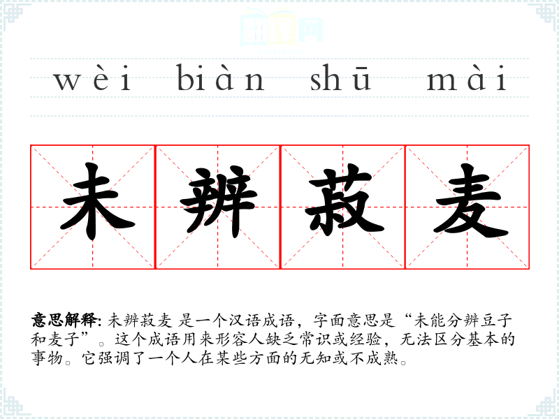 未辨菽麦 是一个汉语成语,字面意思是“未能分辨豆子和麦子”。这个成语用来形容人缺乏常识或经验,无法区分基本的事物。它强调了一个人在某些方面的无知或不成熟。
