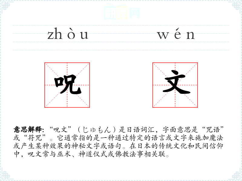 “呪文”(じゅもん)是日语词汇,字面意思是“咒语”或“符咒”。它通常指的是一种通过特定的语言或文字来施加魔法或产生某种效果的神秘文字或语句。在日本的传统文化和民间信仰中,呪文常与巫术、神道仪式或**法事相关联。