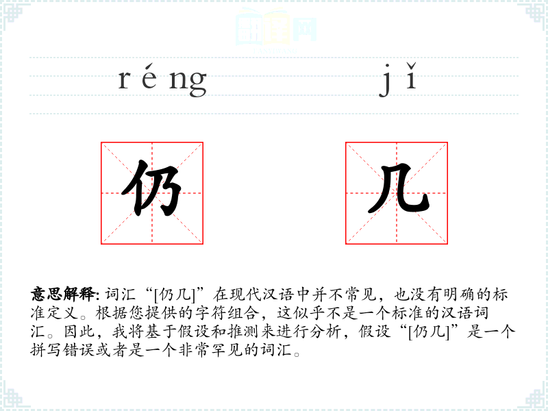 词汇“[仍几]”在现代汉语中并不常见,也没有明确的标准定义。根据您提供的字符组合,这似乎不是一个标准的汉语词汇。因此,我将基于假设和推测来进行分析,假设“[仍几]”是一个拼写错误或者是一个非常罕见的词汇。