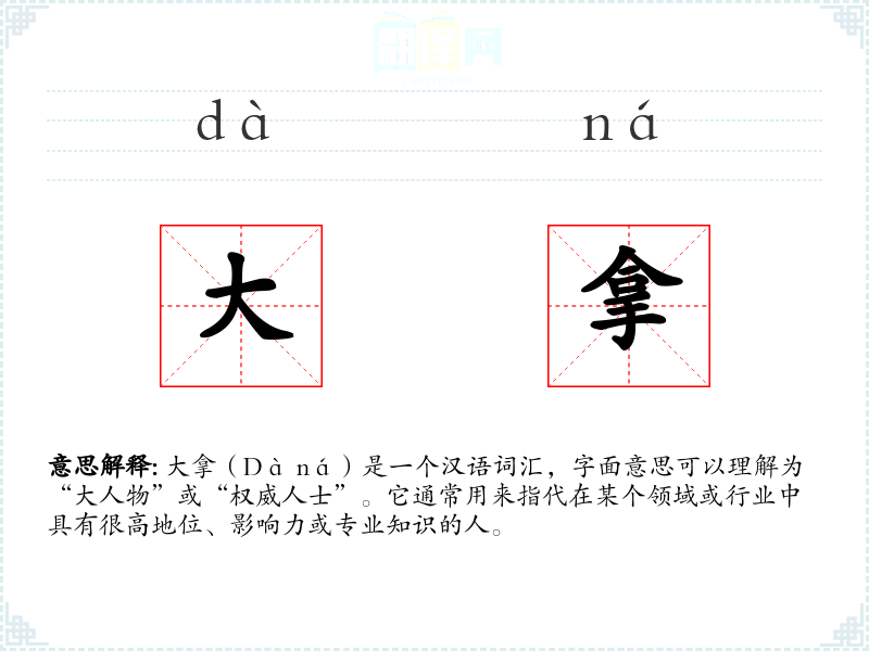 - 专业领域:在专业领域中,“大拿”可能特指在该领域内具有深厚知识和经验的人,如“他是医学界的大拿”。