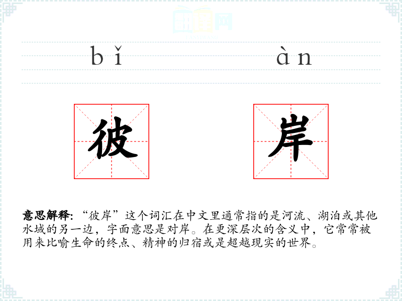 - 专业领域:在地理学或航海学中,“彼岸”可能指具体的对岸地点。
