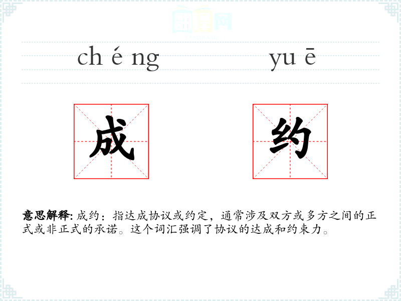 成约:指达成协议或约定,通常涉及双方或多方之间的正式或非正式的承诺。这个词汇强调了协议的达成和约束力。