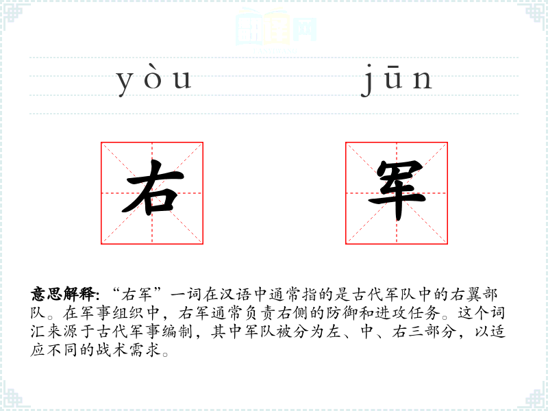 “右军”一词在汉语中通常指的是古代军队中的右翼部队。在军事组织中,右军通常负责右侧的防御和进攻任务。这个词汇来源于古代军事编制,其中军队被分为左、中、右三部分,以适应不同的战术需求。