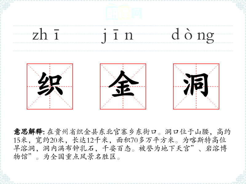 1.在贵州省织金县东北官寨乡东街口。洞口位于山腰,高约15米,宽约20米,长达12千米,面积70多万平方米。为喀斯特高位旱溶洞,洞内满布钟乳石,千姿百态。被誉为地下天宫”、岩溶博物馆”。为全国重点风景名胜区。