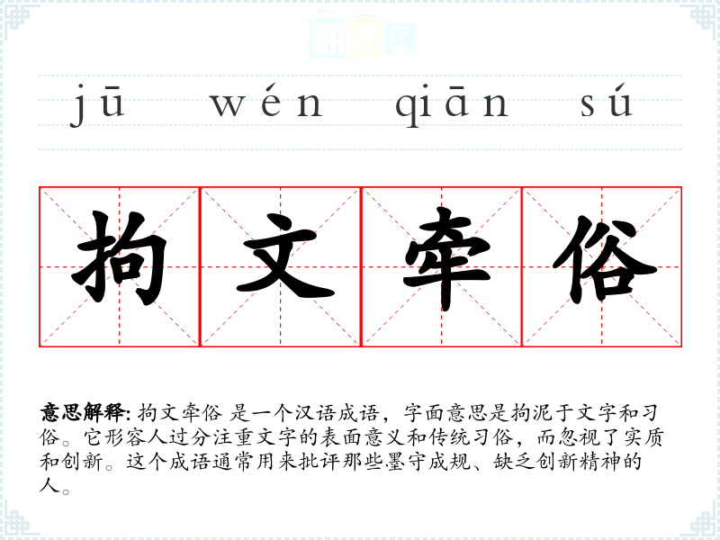 拘文牵俗 是一个汉语成语,字面意思是拘泥于文字和俗。它形容人过分注重文字的表面意义和传统俗,而忽视了实质和创新。这个成语通常用来批评那些墨守成规、缺乏创新精神的人。