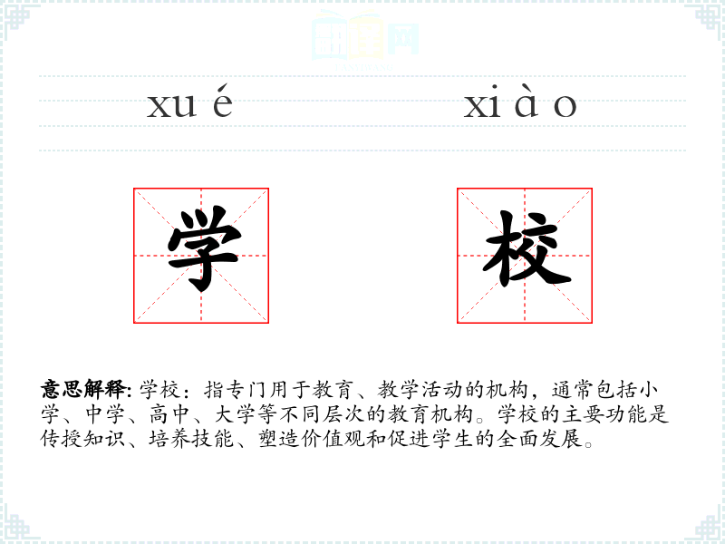 学校:指专门用于教育、教学活动的机构,通常包括小学、中学、高中、大学等不同层次的教育机构。学校的主要功能是传授知识、培养技能、塑造价值观和促进学生的全面发展。