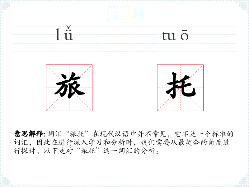 词汇“旅托”在现代汉语中并不常见,它不是一个标准的词汇,因此在进行深入学习和分析时,我们需要从最契合的角度进行探讨。以下是对“旅托”这一词汇的分析: