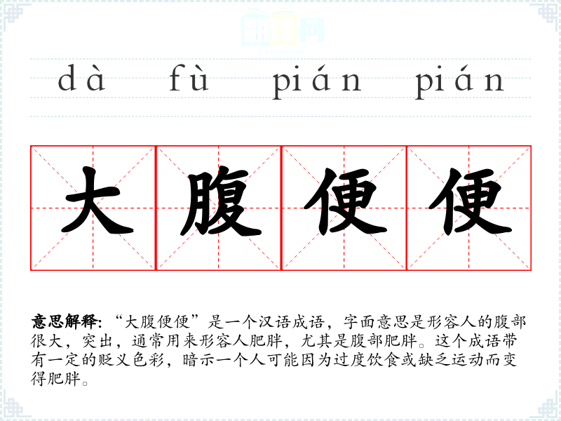 “大腹便便”是一个汉语成语,字面意思是形容人的腹部很大,突出,通常用来形容人肥胖,尤其是腹部肥胖。这个成语带有一定的贬义色彩,暗示一个人可能因为过度饮食或缺乏**而变得肥胖。