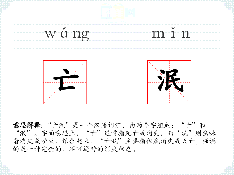 “亡泯”是一个汉语词汇,由两个字组成:“亡”和“泯”。字面意思上,“亡”通常指死亡或消失,而“泯”则意味着消失或湮灭。结合起来,“亡泯”主要指彻底消失或灭亡,强调的是一种完全的、不可逆转的消失状态。