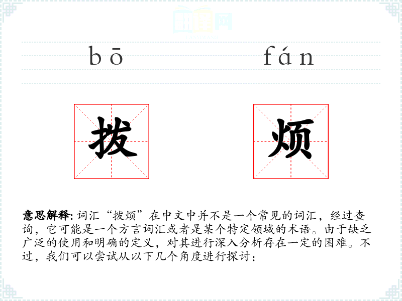 由于“拨烦”不是一个标准汉语词汇,我们无法给出一个确切的基本定义。它可能是指“解决烦恼”或“消除麻烦”的意思,但这仅仅是基于字面组合的猜测。