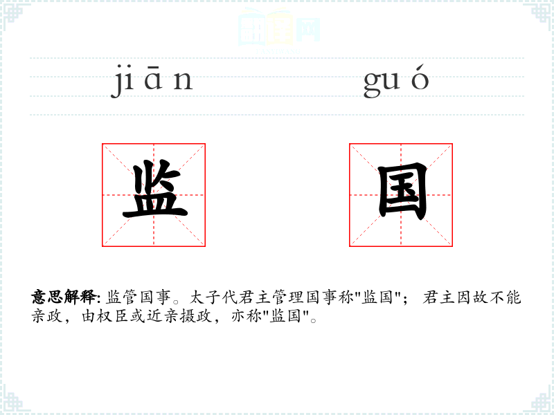 监管国事。太子代君主管理国事称"监国"; 君主因故不能亲政,由权臣或近亲摄政,亦称"监国"。