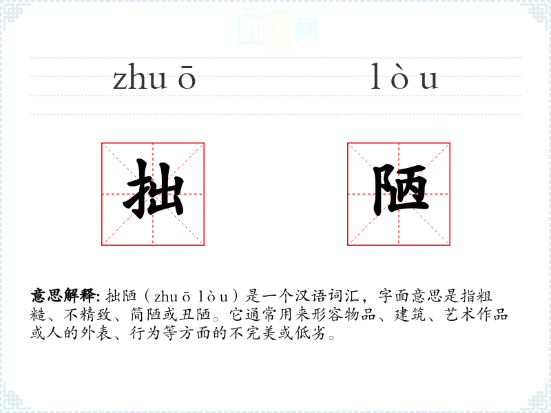 拙陋(zhuō lòu)是一个汉语词汇,字面意思是指粗糙、不精致、简陋或丑陋。它通常用来形容物品、建筑、艺术作品或人的外表、行为等方面的不完美或低劣。