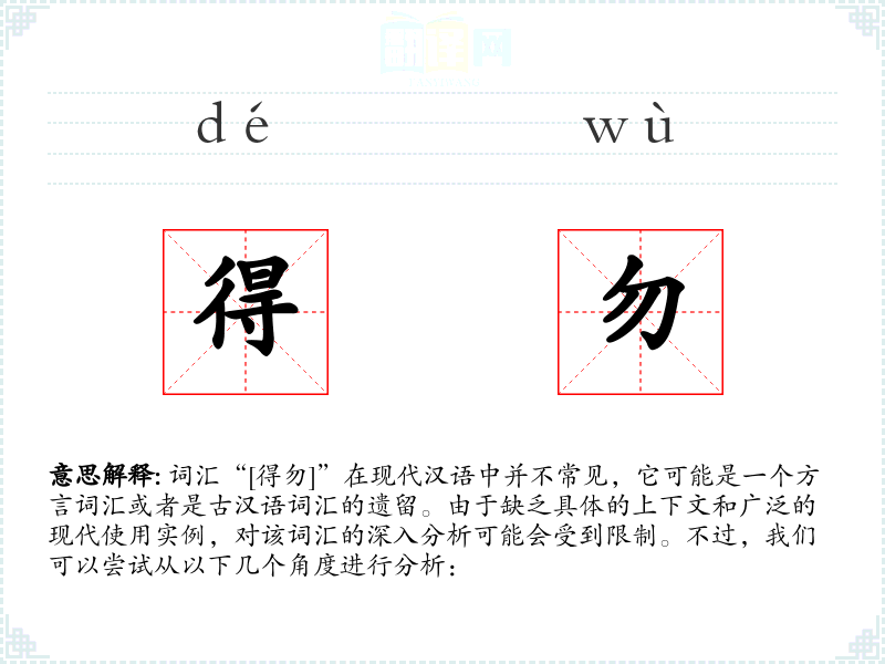 词汇“[得勿]”在现代汉语中并不常见,它可能是一个方言词汇或者是古汉语词汇的遗留。由于缺乏具体的上下文和广泛的现代使用实例,对该词汇的深入分析可能会受到限制。不过,我们可以尝试从以下几个角度进行分析: