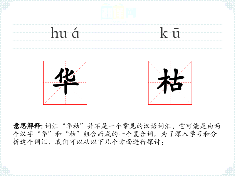 词汇“华枯”并不是一个常见的汉语词汇,它可能是由两个汉字“华”和“枯”组合而成的一个复合词。为了深入学*和分析这个词汇,我们可以从以下几个方面进行探讨: