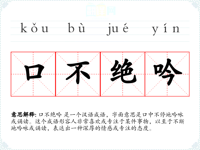 口不绝吟 是一个汉语成语,字面意思是口中不停地吟咏或诵读。这个成语形容人非常喜欢或专注于某件事物,以至于不断地吟咏或诵读,表达出一种深厚的情感或专注的态度。