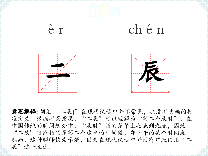 词汇“[二辰]”在现代汉语中并不常见,也没有明确的标准定义。根据字面意思,“二辰”可以理解为“第二个辰时”,在**传统的时间划分中,“辰时”指的是早上七点到九点,因此“二辰”可能指的是第二个这样的时间段,即下午的某个时间点。然而,这种解释较为牵强,因为在现代汉语中并没有广泛使用“二辰”这一表达。