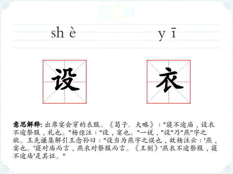 1.出席宴会穿的衣服。《荀子.大略》﹕"寝不逾庙﹐设衣不逾祭服﹐礼也。"杨倞注﹕"设﹐宴也。"一说﹐"设"乃"燕"字之讹。王先谦集解引王念孙曰﹕"设当为燕字之误也﹐故杨注云﹕'燕﹐宴也。'寝对庙而言﹐燕衣对祭服而言。《王制》'燕衣不逾祭服﹐寝不逾庙'是其证。"