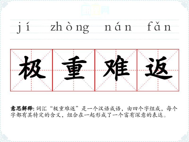 词汇“极重难返”是一个汉语成语,由四个字组成,每个字都有其特定的含义,组合在一起形成了一个富有深意的表达。