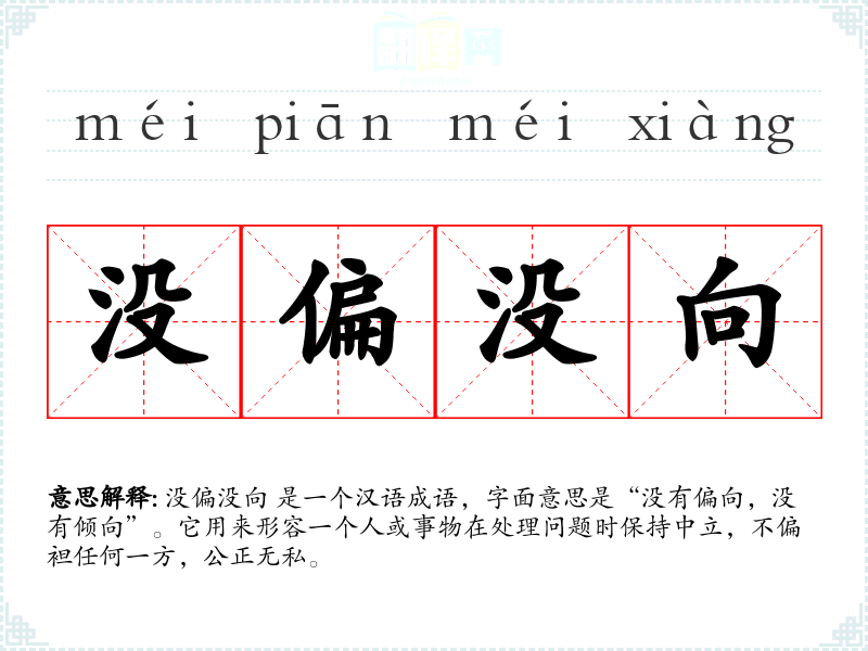 没偏没向 是一个汉语成语,字面意思是“没有偏向,没有倾向”。它用来形容一个人或事物在处理问题时保持中立,不偏袒任何一方,公正无私。