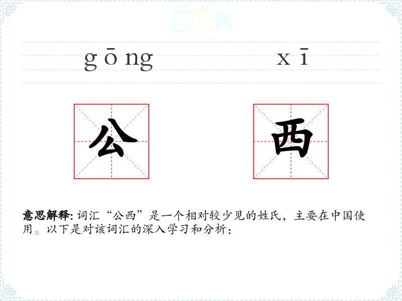 词汇“公西”是一个相对较少见的姓氏,主要在*使用。以下是对该词汇的深入学和分析: